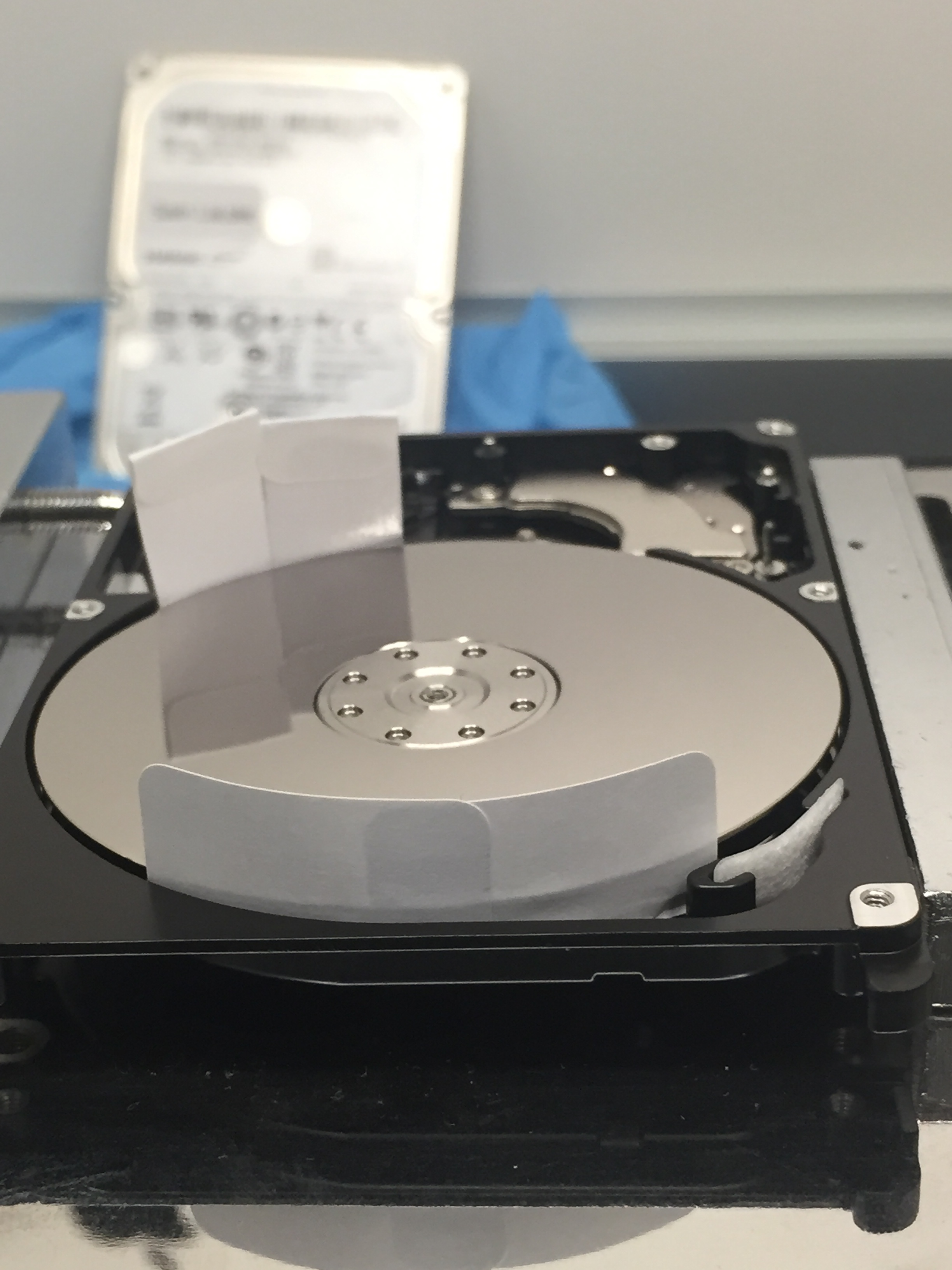 The position of the heads is a normal sight for this type of problem, however the little black thing sitting next to it is not a good sign. Its called a slider and as this drive has 4 heads and therefore 4 sliders the chances are that more than one slider has come off and went walkies. On the top platter thats fine and dandy, but where are the other 3? This is where you need to get creative. In its current state this drive is unrecoverable.